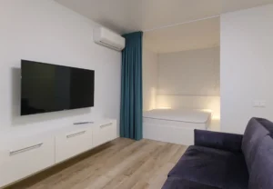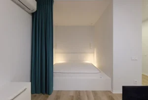Квартира для оренди. Замовник скористався нашою акцією та отримав у подарунок технічний дизайн-проект. Після перепланування вийшла функціональна та затишна студія, в якій знайшлося місце для обідньої зони, зони відпочинку та спальному місцю за шторою.